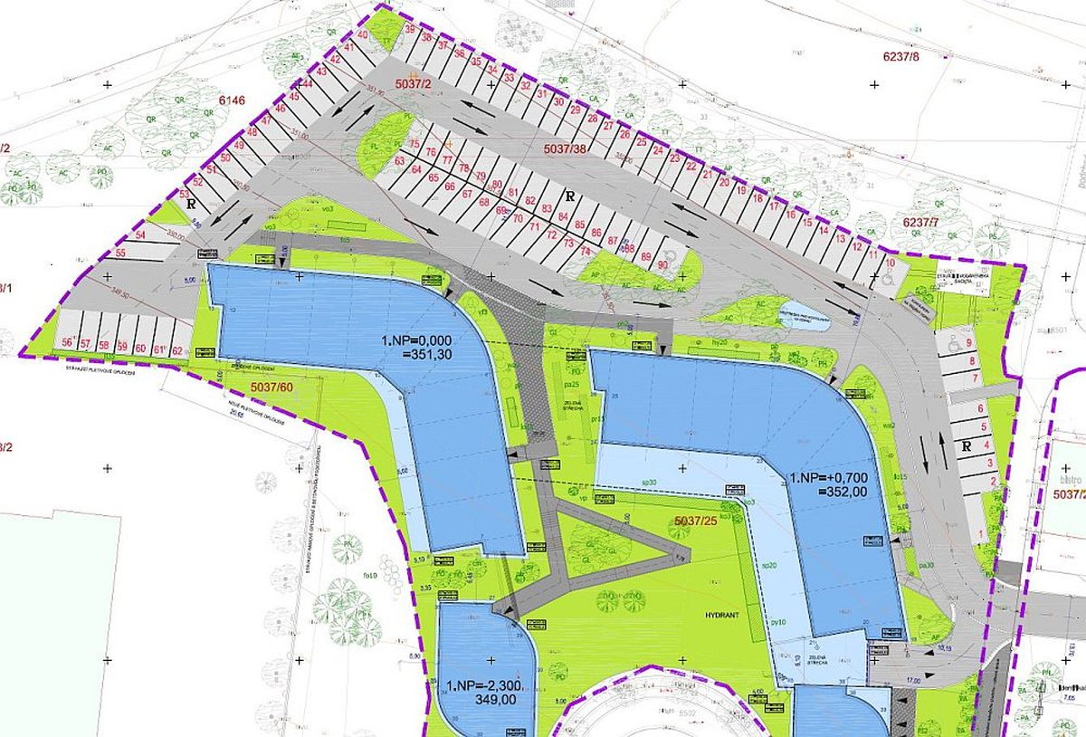 Komunikační napojení V okolí budou provedeny nové zpevněné plochy pro komunikační napojení objektů na stávající komunikační systém v území. Celkem je na řešené ploše umístěno 139 parkovacích stání, z toho 49 parkovacích míst se nachází v 1.PP pod bytovými domy A,B,D a 90 parkovacích míst je umístěno na nových zpevněných plochách v těsné blízkosti navrhovaných objektů. Vjezd a výjezd do 1.PP bude z východní strany od ulice Horníkovy.