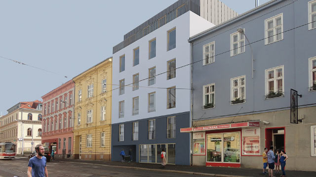 Nově navržený objekt jak výškově, tak architektonicky doplňuje zástavbu v ulici Hybešova. Navržená fasáda do ulice Hybešova svým vzhledem určuje tvář celého domu.